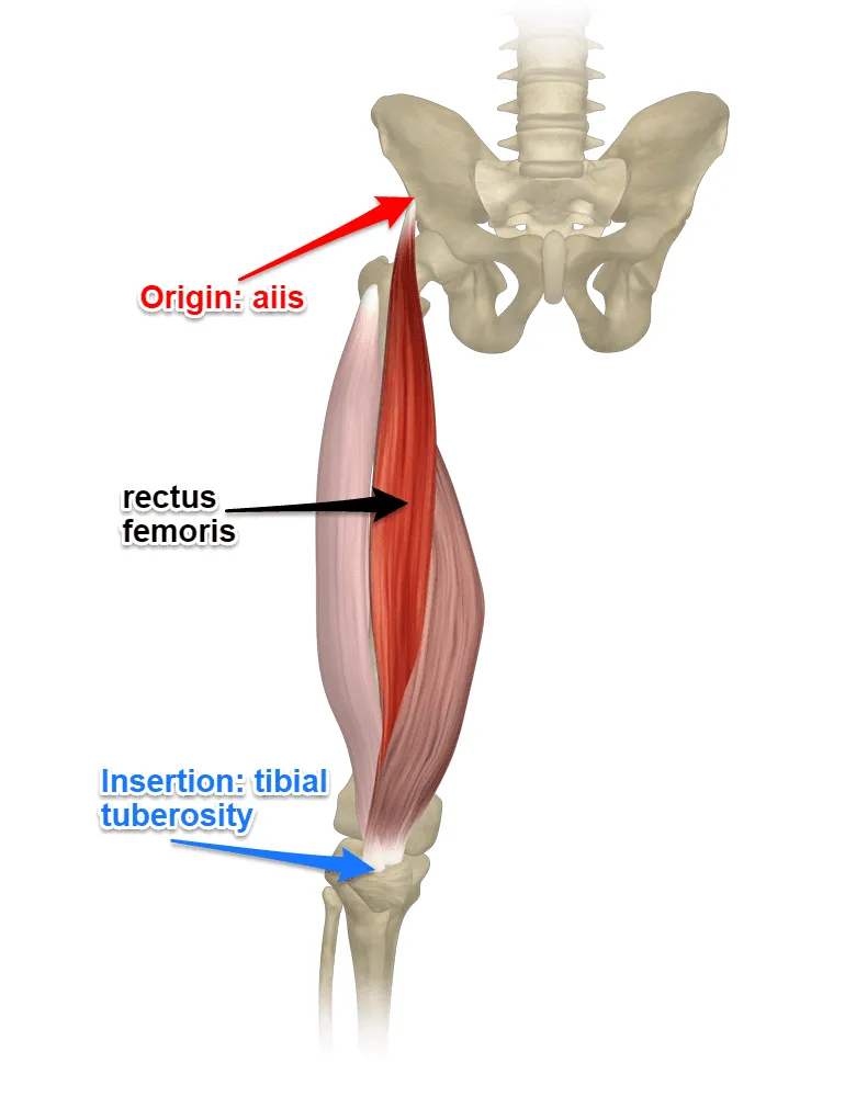 - Rectus Femoris (runs down the front of the thigh and crosses both the hip and knee)