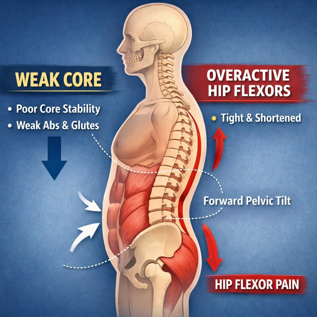 Weak deep-core muscles force hip flexors to stabilize the spine.